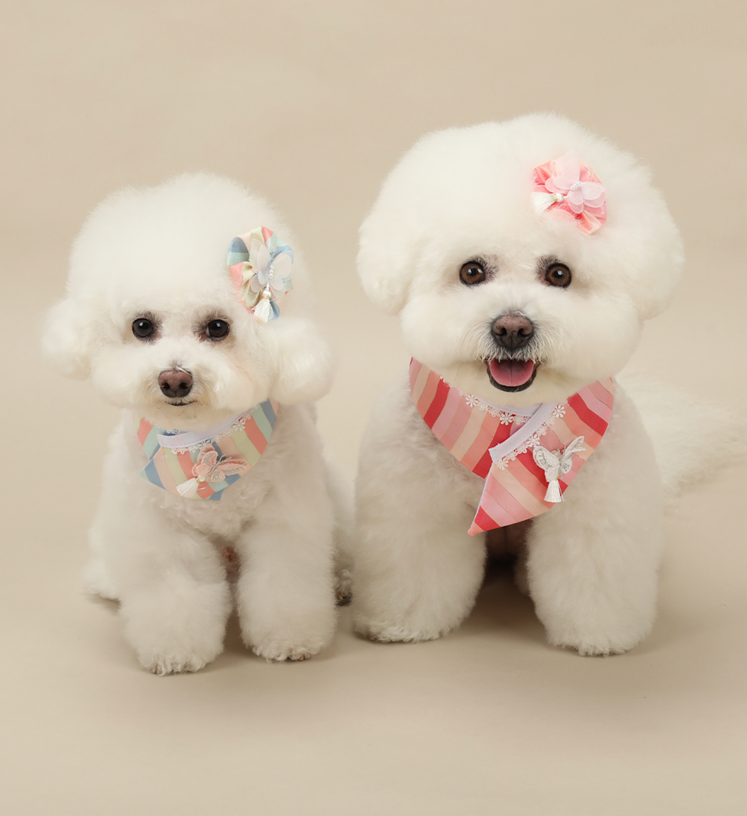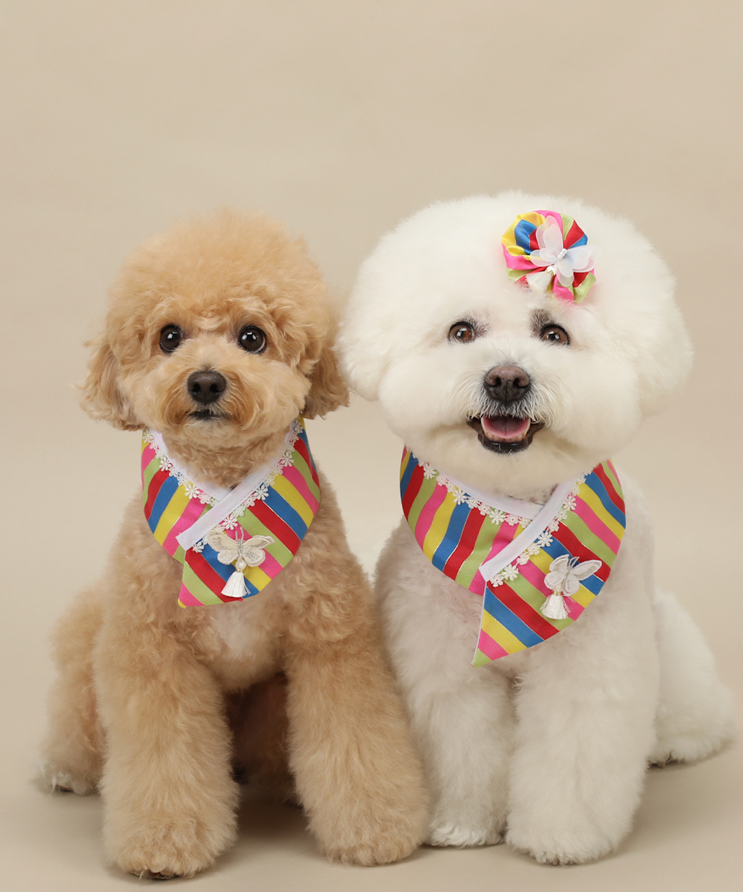 A traditional Korean-inspired cape for pets featuring signature Saekdong stripes and butterfly-adorned lace. The lightweight design with snap button closure makes dressing effortless, while the elegant drape suits special occasions and photography.